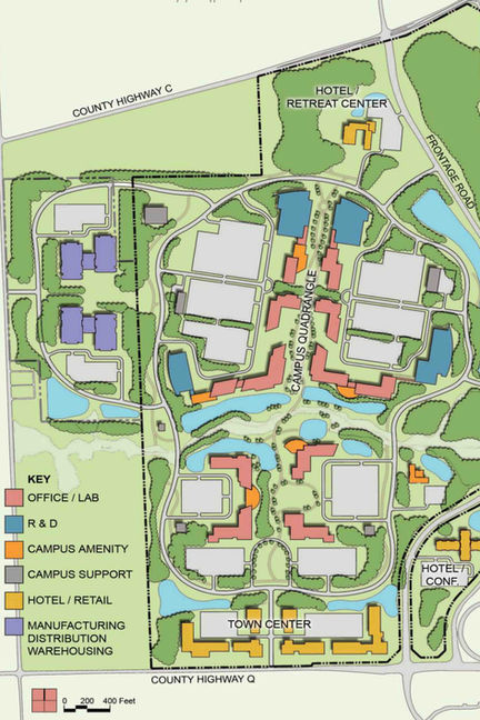 The plan calls for a phased development to accommodate 10,000 employees with support retail, hotel and employee service to assist in the function of the campus. The campus will be modeled in the great tradition of corporate and academic campuses in the United States. The determining features will be a pedestrian centered environment sharing common open space to enhance communication, corporate identification, and the creation of a sense of place that speaks to the highest qualities of both corporation and community.